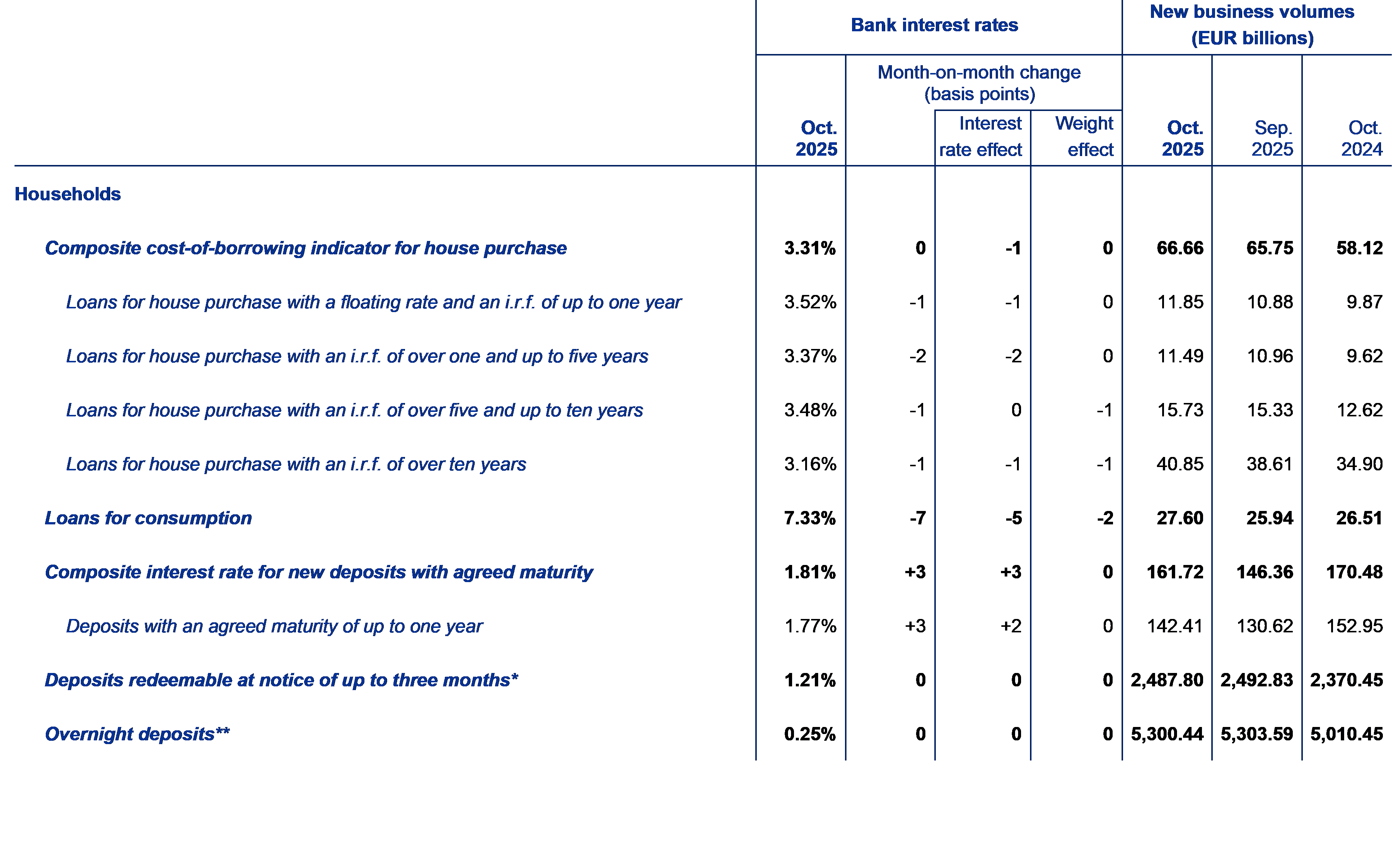 The composite cost-of-borrowing indicator, which combines interest rates on all loans to households for house purchase, showed no change in October 2025. The interest rate on loans for house purchase with a floating rate and an initial rate fixation period of up to one year remained broadly unchanged at 3.52%. The rate on housing loans with an initial rate fixation period of over one and up to five years stayed almost constant at 3.37%. The interest rate on loans for house purchase with an initial rate fixation period of over five and up to ten years remained broadly unchanged at 3.48%. The rate on housing loans with an initial rate fixation period of over ten years stayed almost constant at 3.16%. In the same period the interest rate on new loans to households for consumption decreased by 7 basis points to 7.33%.