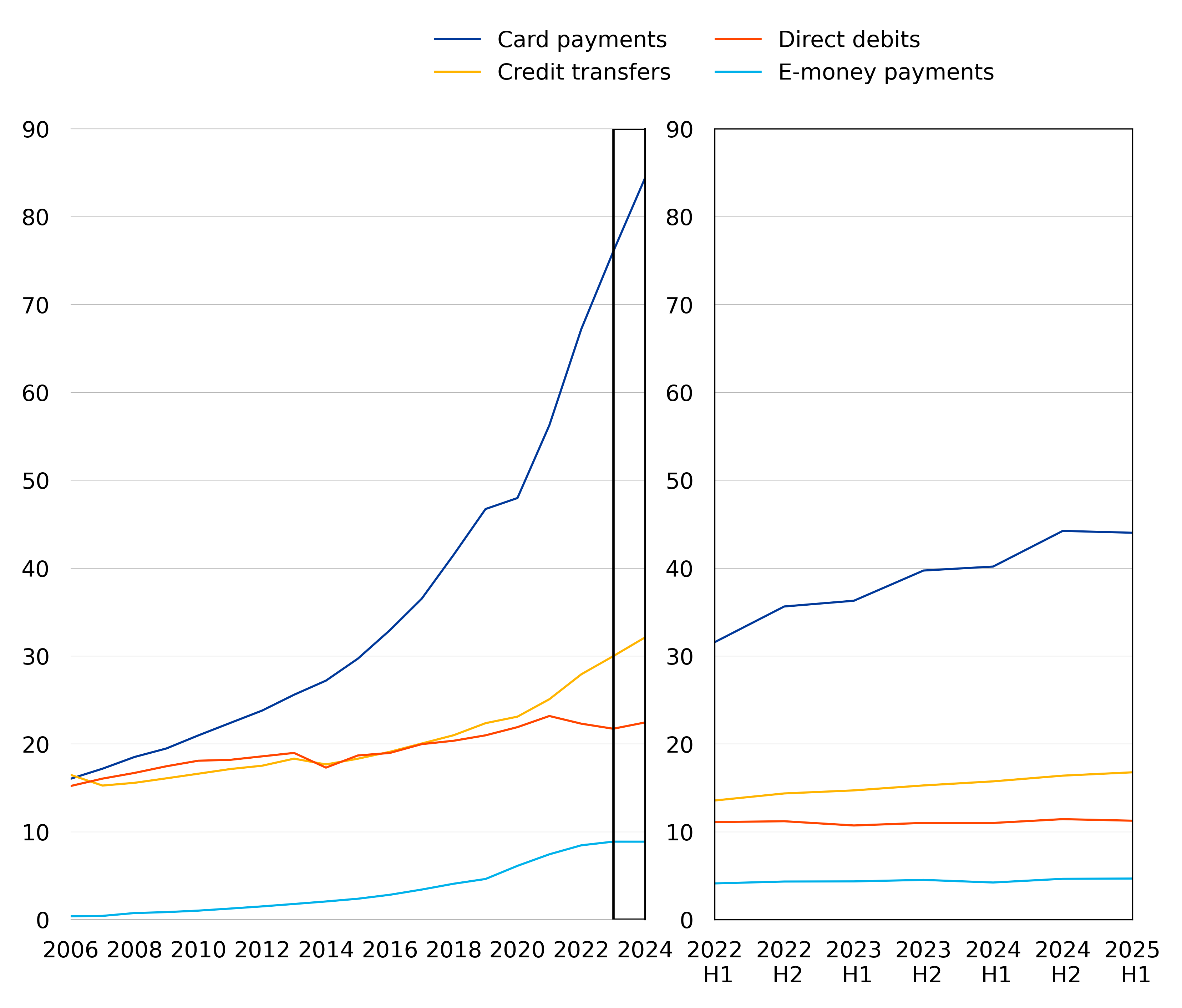 Note: Data have been partially estimated for periods prior to 2010, as methodological changes were implemented in those years and some data are not directly available. The historical estimations done by the ECB ensure comparability of figures over the entire period. Statistics were also collected for cheques, money remittances and other payment services which together accounted for 1% of the total number of non-cash euro area payment transactions in the first half of 2025.