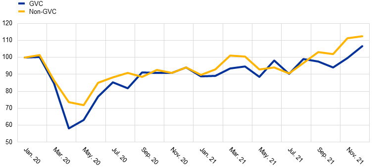 Our data show that firms involved in global production networks in the pre-crisis period experienced the sharpest fall in exports at the onset of the COVID-19 crisis, and recovered at a slower pace than non-GVC exporters after the economic reopening (Chart 1, panel a). In April 2020 GVC exporters recorded export volumes that were 42% lower than the levels recorded in January 2020. For non-GVC exporters, the cumulative decline was less drastic, reaching a trough in May 2020 at 28% below the level recorded in January 2020. The two groups diverged further when the pandemic-related restrictions were lifted in the summer of 2020 and when the recovery took shape over the following year. By March 2021 nominal exports of firms not involved in global value chains had reached their January 2020 levels and by September 2021 they had recovered well beyond their pre-pandemic levels, while it took until December 2021 for GVC firms to exceed their January 2020 export levels.