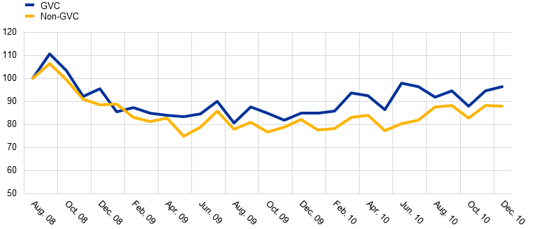 Interestingly, during the 2008 global financial crisis the situation was reversed (Chart 1, panel b), with GVC firms recording much smaller reductions in their nominal exports than their non-GVC counterparts. Compared with August 2008, nominal exports of GVC firms had fallen by 19% in August 2009, while exports of similar non-GVC firms had fallen by a quarter at their lowest point in May 2009. In comparison with the COVID-19 crisis, the collapse in trade in 2008 was less sizeable and less abrupt, although it was more persistent for both types of firm, suggesting that whether supply value chain trade is mainly a source of vulnerability or a source of resilience ultimately depends on the nature of the crisis.
