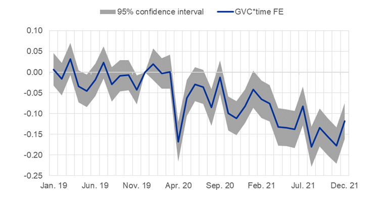 Notes: The estimated βj is computed, as in Lebastard et al. (2023), using the following econometric specification: inexportit= j=-1224βj COVID19jt×GVCi+FEi+FEt+εit, where the dependent variable is the natural logarithm of exports. The treatment group comprises all exporting firms involved in global value chains (GVCi is equal to 1 if the firm imported at least once in the six months immediately before the crisis) while the control group comprises the other continuous exporters. The econometric model controls for the size of the firms by including firm fixed effects and for time-specific shocks using time fixed effects (FE). The reference month is December 2019.