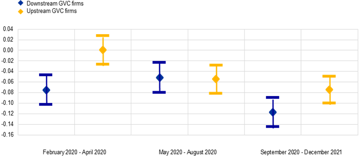 Notes: The coefficient estimates, as in Lebastard et al. (2023), are based on the following specification inexportit=β1GVCi×Upstreami×COVID19t+β2GVCi×1-Upstreami×COVID19t+FEi+FEt+εit. Upstreami is a dummy variable that takes the value 1 if the firm’s upstreamness index is above the median.