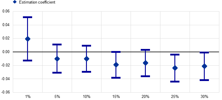 The pandemic has raised the question of whether diversification would foster supply chain resilience and therefore help reduce countries’ vulnerability to future external shocks. We try to shed some light on this by estimating the effect of diversification of imports among GVC firms on their export performance. We follow the approach in Lafrogne-Joussier et al. (2022), where a firm is considered as diversifying its GVC involvement whenever its “core” imported products (i.e. representing at least 1% of its imports before the pandemic) are sourced from at least two countries. In our study, however, we test the effect of diversification by allowing the threshold for a product to be identified as “core” to vary between 1% and 30% of total imports between July and December 2019. Our results, as shown in Chart 4 below, suggest that exports of GVC firms suffered from the lack of diversification for products representing more than 15% of total imports.