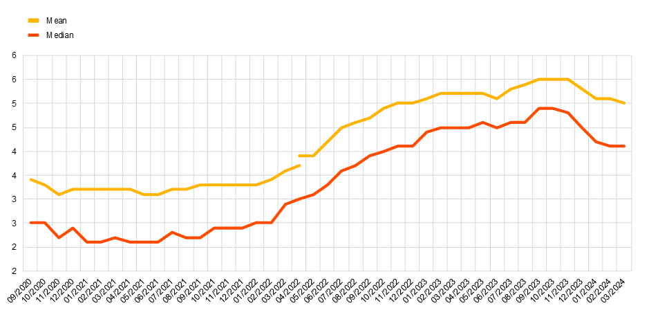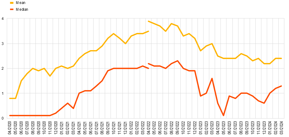 Notes: Weighted estimates. The median is computed on the basis of a symmetric linear interpolation that accounts for rounding of responses. Mean values are winsorised at the 2nd and 98th percentiles of each survey round and country. The shift in the time series in April 2022 visualises the change in the composition of the aggregates due to the inclusion of five additional countries (IE, GR, AT, PT and FI).