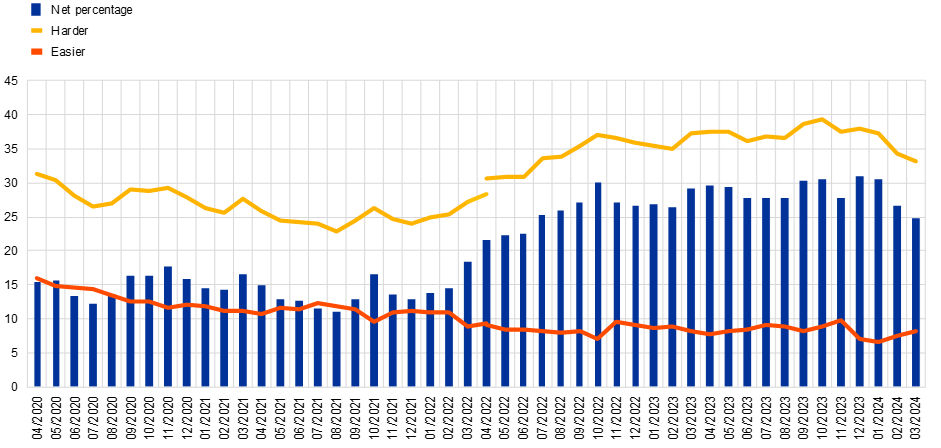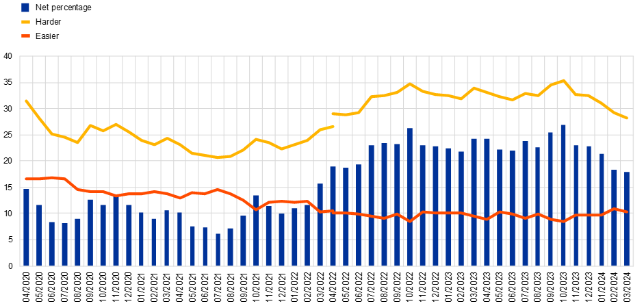 Notes: Weighted estimates. Net percentages are obtained by subtracting the percentage of respondents indicating that access to credit is easier from the percentage of respondents indicating that access to credit is harder. The shift in the time series in April 2022 visualises the change in the composition of the aggregates due to the inclusion of five additional countries (IE, GR, AT, PT and FI).