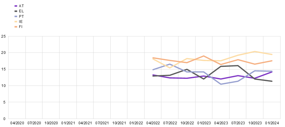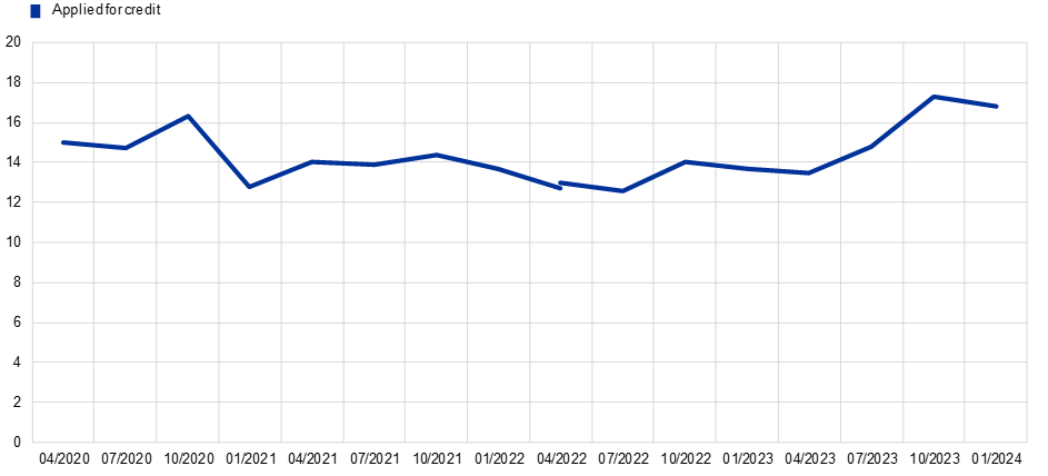 Notes: Weighted estimates. The line shows the percentage of respondents indicating that they applied for at least one category of credit in the previous three months. The shift in the time series in April 2022 visualises the change in the composition of the aggregates due to the inclusion of five additional countries (IE, GR, AT, PT and FI).