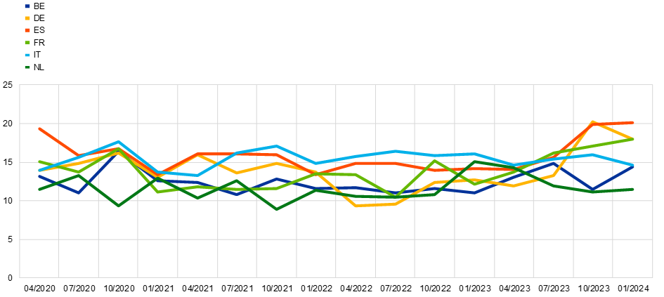 Notes: Weighted estimates. The lines show the percentage of respondents indicating that they applied for at least one category of credit in the previous three months. The shift in the time series in April 2022 visualises the change in the composition of the aggregates due to the inclusion of five additional countries (IE, GR, AT, PT and FI).