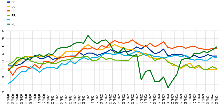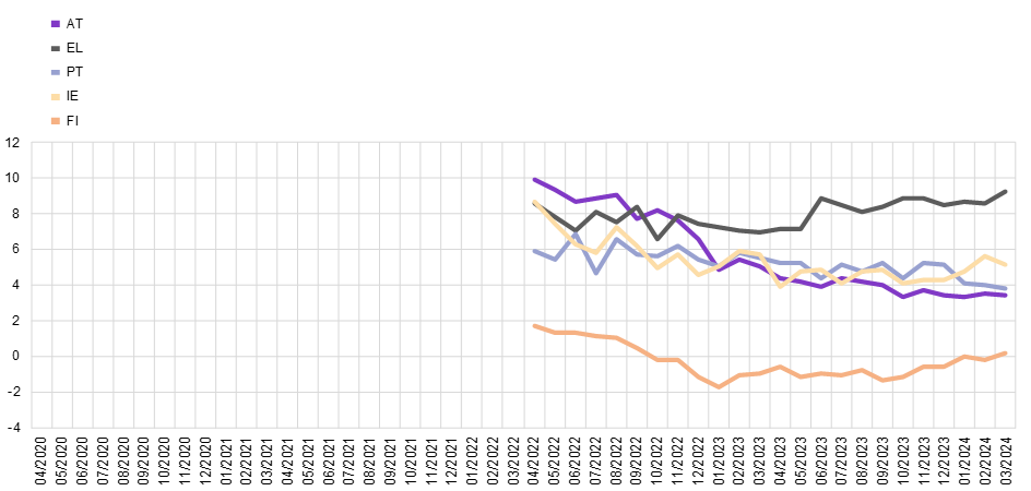Notes: Weighted estimates. Net percentages are obtained by subtracting the percentage of respondents indicating that prices will decrease from the percentage of respondents indicating that prices will increase. The shift in the time series in April 2022 visualises the change in the composition of the aggregates due to the inclusion of five additional countries (IE, GR, AT, PT and FI).