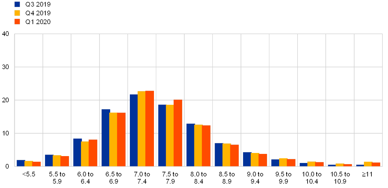 The mean expectation for the rate on the ECB’s main refinancing operations was for it to remain around 0% in 2020 and 2021 before increasing marginally in 2022. This implies a later pickup than forecast in the previous round (see panel (a) of Chart 12).