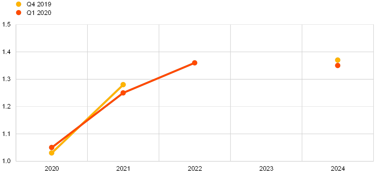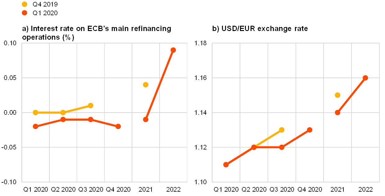 The average expected USD/EUR exchange rate was largely unchanged from the previous round and it is expected to appreciate marginally from around 1.12 in 2020, to 1.14 in 2021 and further to 1.15 in 2022 (see panel (b) in Chart 12).