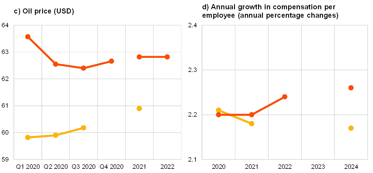 US dollar-denominated oil prices (per barrel) remain broadly stable at around USD 63 over the period 2020-2022. This implies that forecasters now expect prices to be around 5% higher on average than expected in the Q4 2019 survey (see panel (c) of Chart 12). Given the largely unchanged forecasts for the USD/EUR exchange rate, these results imply a profile for the oil price in euro that is also around 5% higher relative to the previous survey.